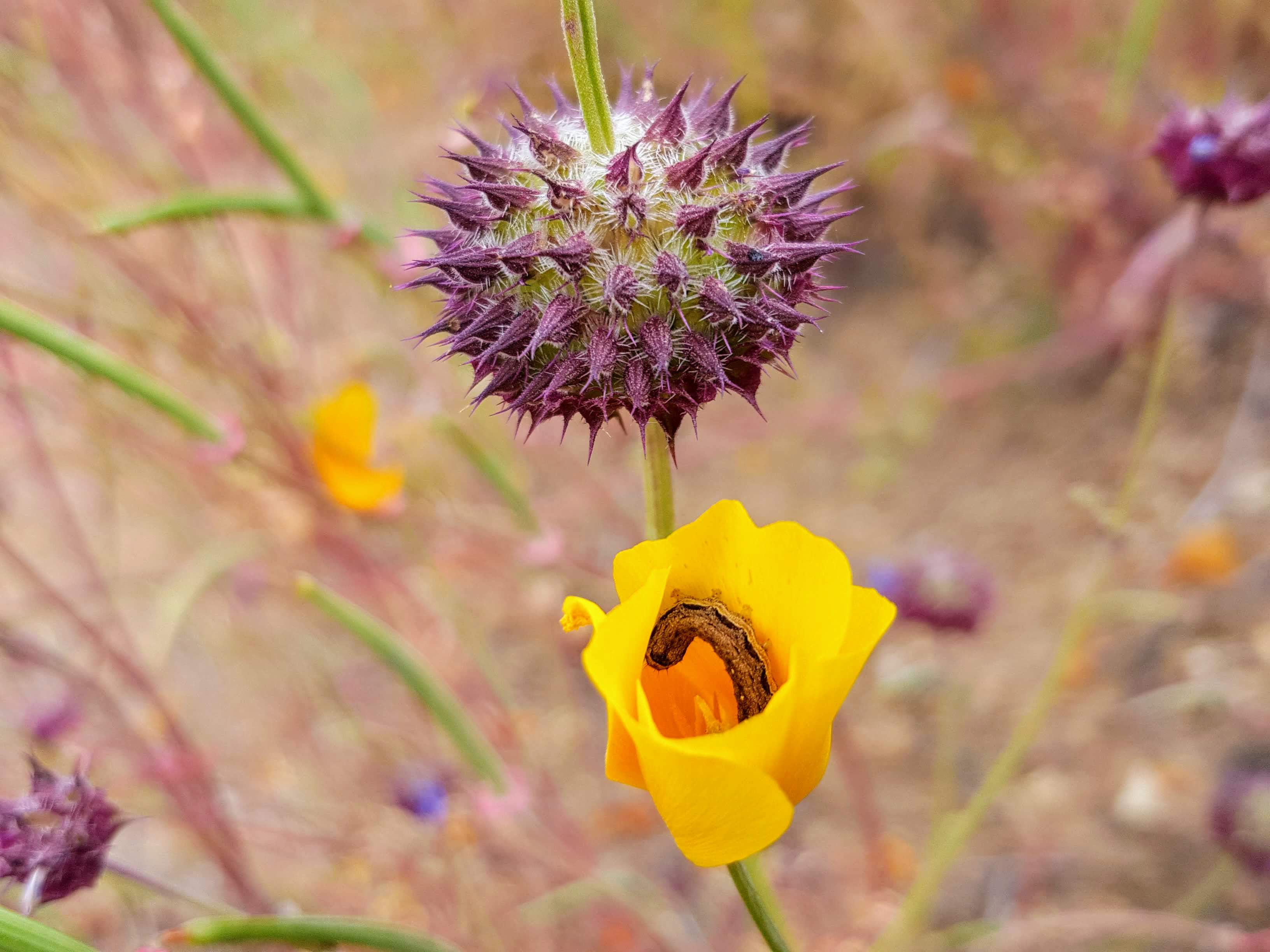 Desert chia (Salvia columbariae), though the far right image includes a California poppy with a houseguest.